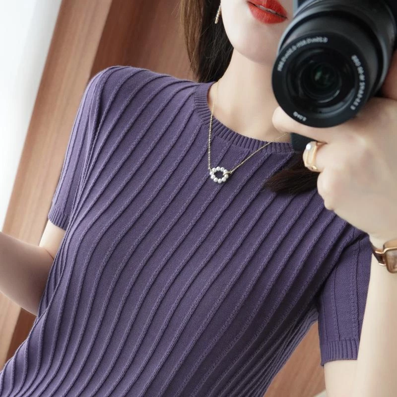 🔥 Áo Thun Dệt Kim Tay Ngắn Cổ Tròn Màu Tím Đơn Giản Thời Trang Phong Cách Hàn Quốc Cho Nữ đang giảm giá!