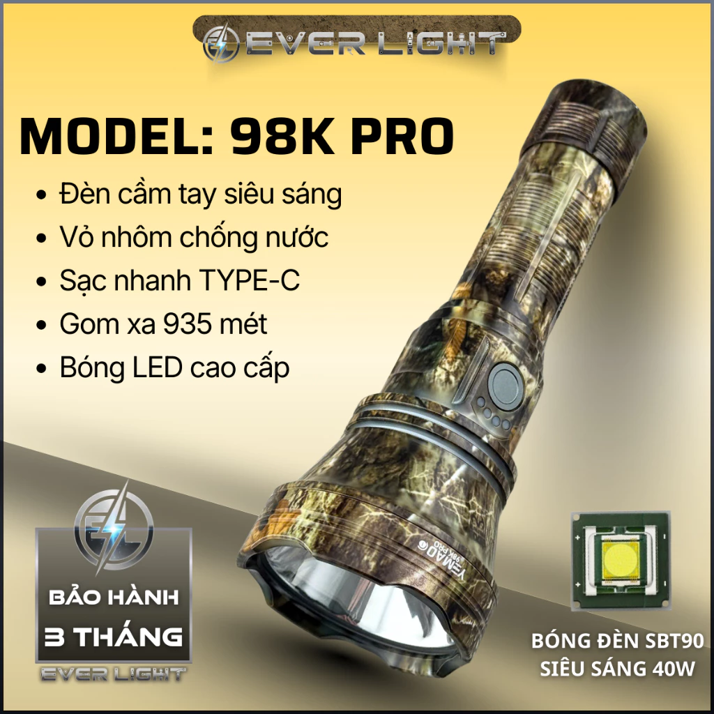Trong số các mẫu hiện đang lưu hành, Đèn pin cầm tay siêu sáng 98K PRO (mã sản phẩm: 98K PRO) thu hút sự chú ý nhờ những tính năng sau: