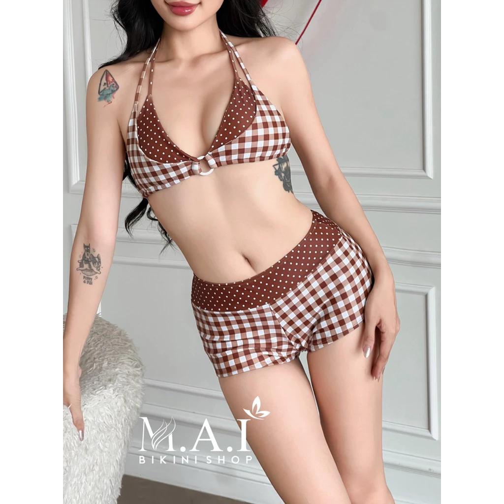🔥 ??? ?????? •CÓ SẴN HN• Sét Bikini 2 Mảnh Áo Khoen Quần Đùi,Hoạ Tiết Chấm Bi Phối Caro Nâu Cho Nữ đang giảm giá!