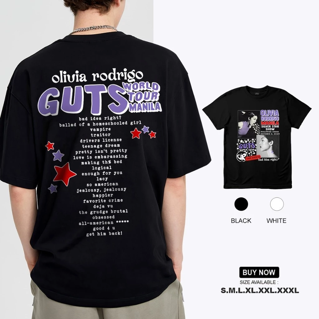 - Thiết kế độc đáo: Áo được thiết kế với họa tiết và màu sắc theo chủ đề của tour du lịch âm nhạc GUTS World Tour 2024 của Olivia Rodrigo.