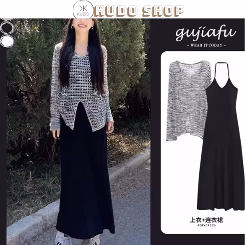🔥 Sét áo choàng dệt kim + váy cổ yếm suông dáng dài, Đầm body sang trọng tôn dáng phong cách Hàn Quốc Veestore33 đang giảm giá!