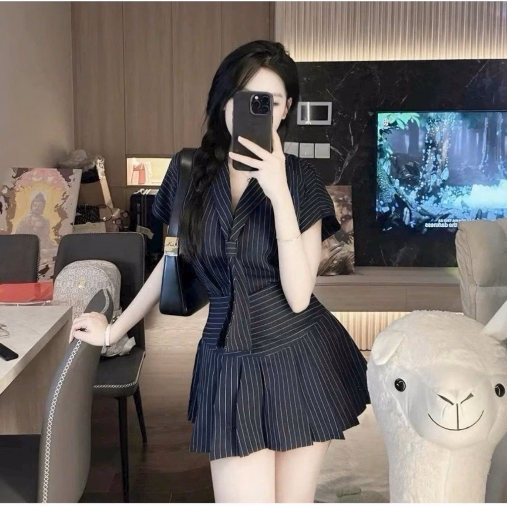 🔥 Set váy hot girl áo đũi vân mây xịn cổ sơ mi kèm cà vạt mix chân váy ôm chất kaki đi chơi cực dễ thương đang giảm giá!