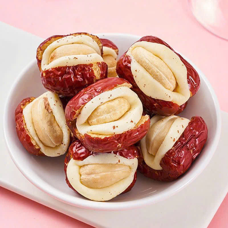 - Snack hạt trái cây tẩm men (ví dụ: táo đỏ kẹp hạt điệu): Kết hợp giữa trái cây tươi và hạt, mang lại vị ngọt nhẹ và độ no lâu hơn so với snack trái cây khô thông thường.