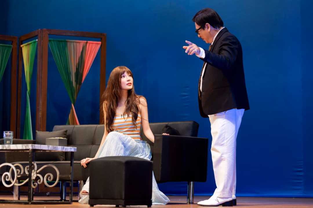 Thúy Diễm (phải) và Kim Tuyến nhận hoa từ khán giả sau khi kết thúc vở diễn.Cô tung hứng với bạn diễn Kim Tuyến trong phân đoạn đấu tranh tâm lý.Nói về cảm xúc khi đứng trên sân khấu, Thúy Diễm cho biết những năm qua dành nhiều thời gian cho phim ảnh nên cô hồi hộp khi trở lại với kịch.Trương Thanh Long cũng tới thưởng thức vở kịch.